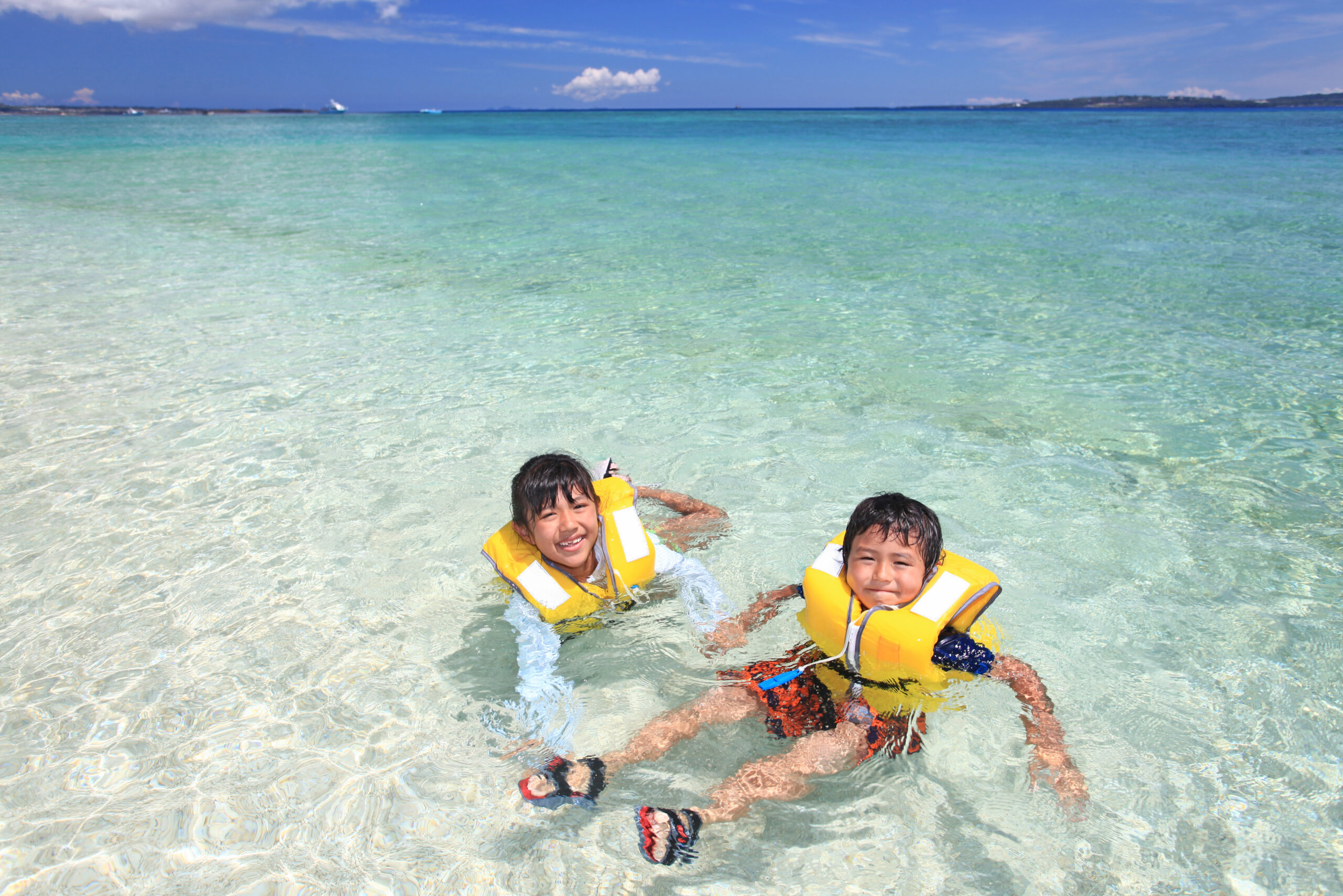 澄んだ海と海水浴を楽しむ笑顔の姉弟
